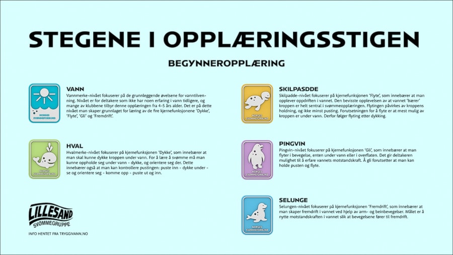 Når svømmeren mestrer ferdighetene på ett nivå, går de videre til neste trinn.