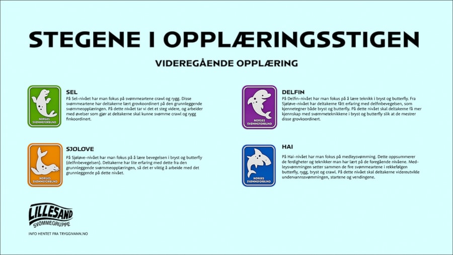 Vi tilbyr svømmekurs opp til et visst nivå, men Delfin og Hai er ikke en del av vårt kursprogram.