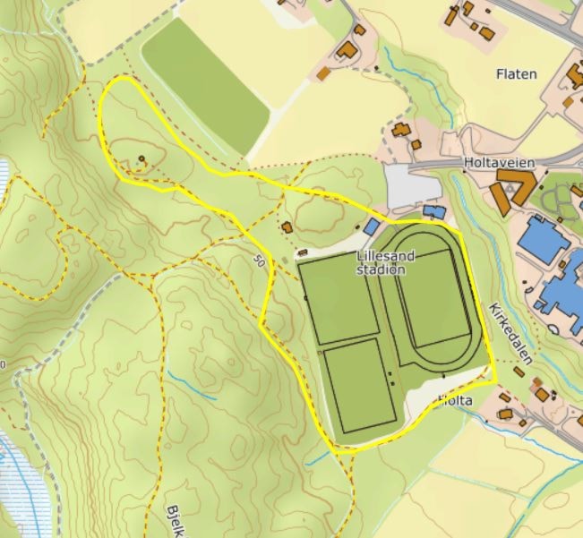 - Start på Lillesand Stadion. Ut hovedporten på stadion og rett opp i lysløypa hvor vi skal løpe lys løypa nærmeste Holta og vi etterpå kommer inn i på stadion igjen og løper gjennom start/mål buen igjen.