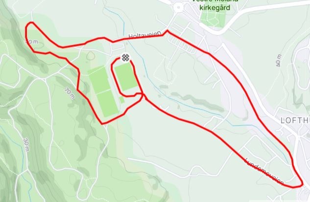 - Start på Lillesand Stadion. Ut hovedporten på stadion og rett opp i lysløypa hvor vi skal løpe lys løypa nærmeste Holta og vi etterpå kommer inn i på stadion igjen og løper gjennom start/mål buen igjen.